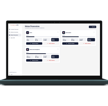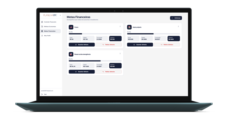 Metas Financeiras — Cadastre seus sonhos (reserva de emergência, carro, casa própria) e acompanhe o progresso em tempo real. Você sabe exatamente quanto falta e quando vai chegar lá.
