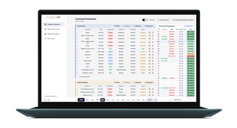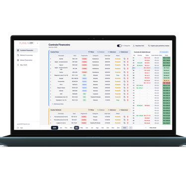 Controle Financeiro — Registre custos fixos, custos variáveis e receitas. Veja o saldo dia a dia, com um semáforo visual que mostra quando o mês está no verde ou no vermelho, sem precisar fazer nenhuma conta.
